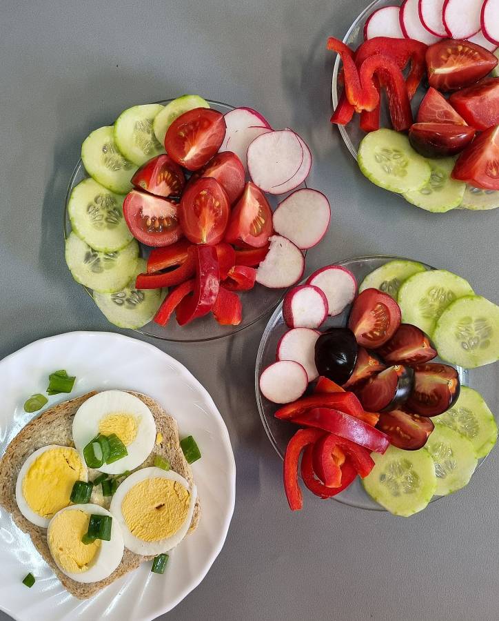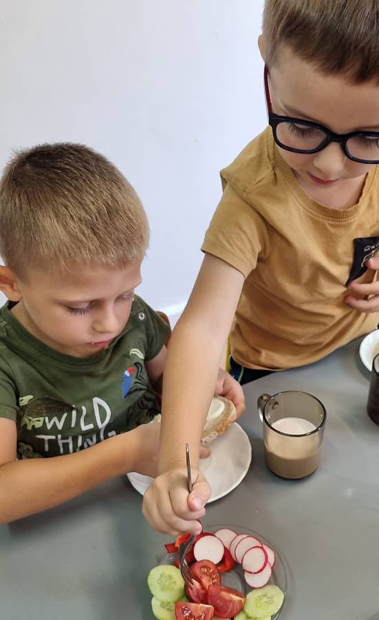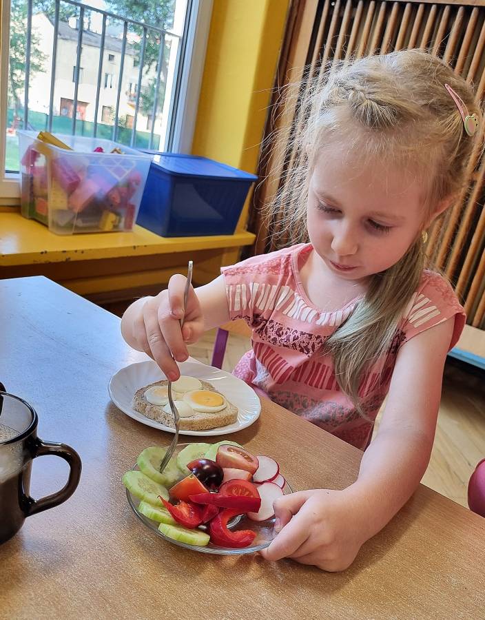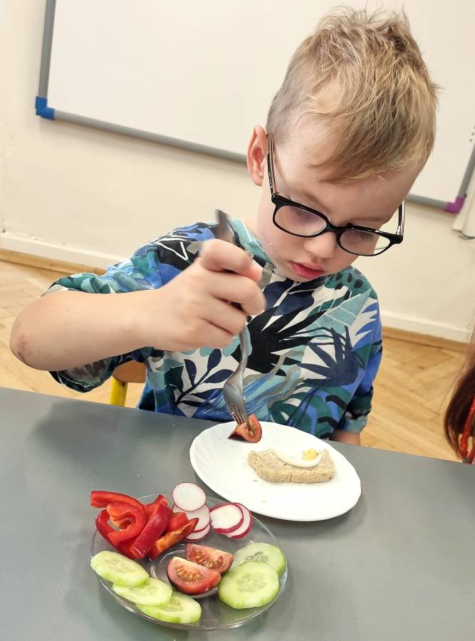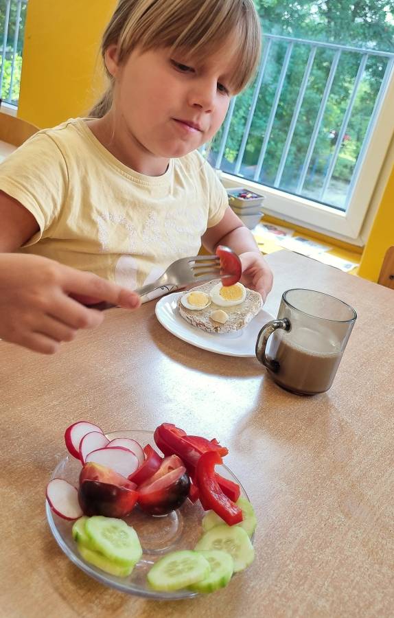Dziś na śniadanie przedszkolaki próbowały pomidorków z naszego warzywniaka. O wiele prościej jest zachęcić dzieci do jedzenia warzyw i owoców,jeśli zostaną one przez nie samodzielnie zerwane.