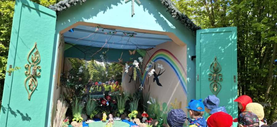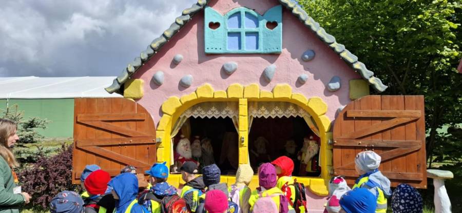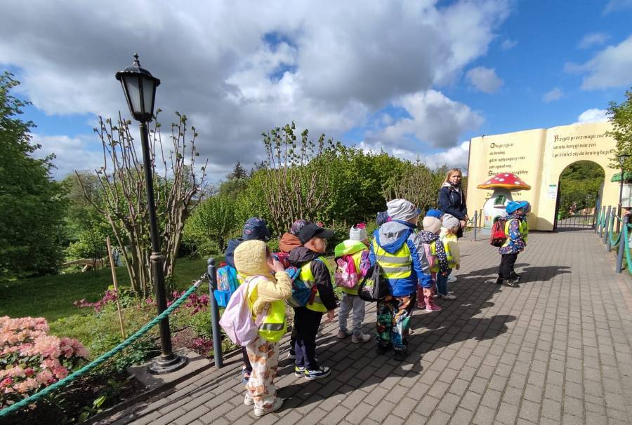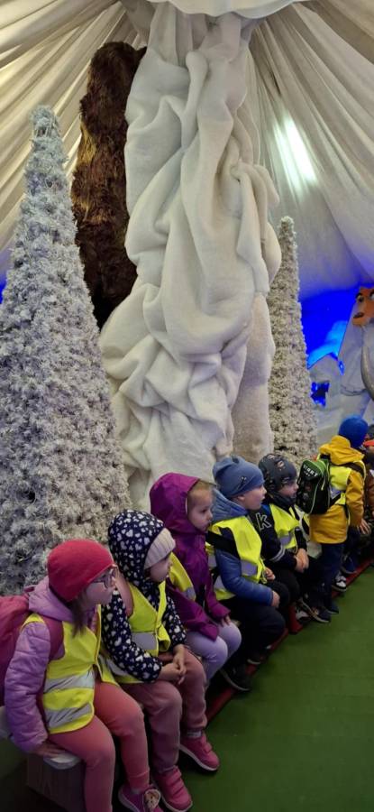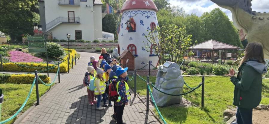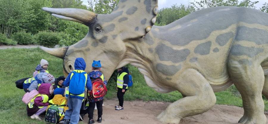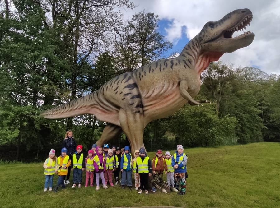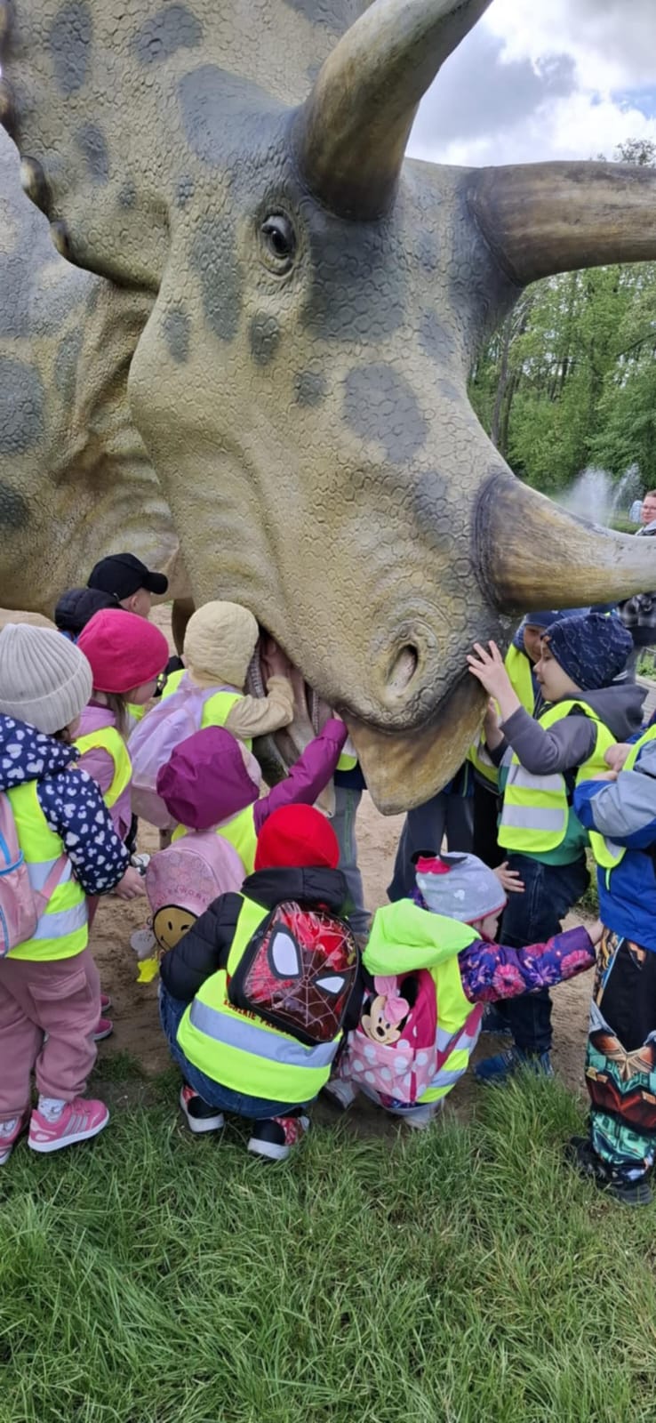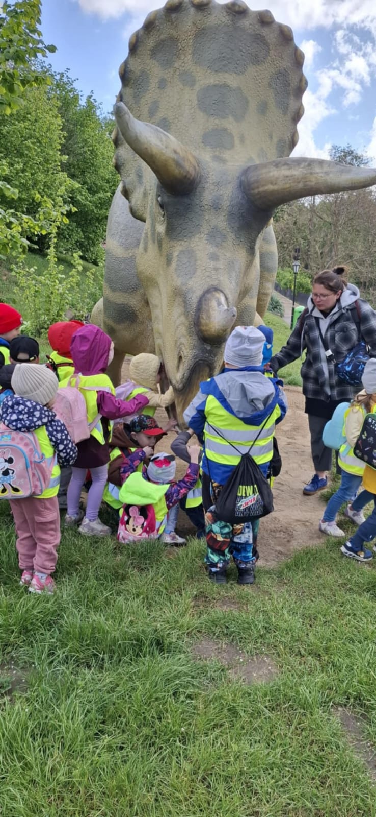 Dzisiaj dzieci z grupy Zwinne Koty wybrały się na długo wyczekiwaną wycieczkę do Dinopark Kołacinek Mimo chłodu na dworze, atmosfera była gorąca z wrażenia jakie zrobiły na dzieciach ogromne figury dinozaurów. Przedszkolaki z zainteresowaniem słuchały opowieści o ich prehistorycznym życiu przekazywanych przez przemiłą Panią przewodnik. Dzieci dowiedziały się co dinozaury jadły, dlaczego jedne były kolorowe, inne nie, jak się broniły i dlaczego tych pięknych i tajemniczych stworzeń już z nami nie ma. Okazało się, że niektóre dzieci posiadają dużą wiedzę o życiu dinozaurów i wiele z nich potrafią nazwać. Drugim etapem wycieczki były odwiedziny w Bajkowej krainie. Przepiękne makiety przedstawiające sceny i postacie z wielu znanych bajek wzbudziły zachwyt dzieci i nauczycielek. Wyprawę zakończyła wspaniałą zabawa w tamtejszym figloraju. To był bardzo miły i pełen wrażeń dzień w grupie Zwinne koty