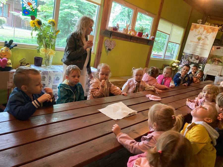 Na miejscu przywitała nas pani Marzena, która z ogromną cierpliwością i w bardzo przystępny sposób opowiedziała dzieciom o tym, jak pracują pszczoły, jak wygląda ul od środka i jak powstaje miód.
