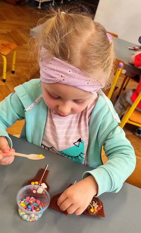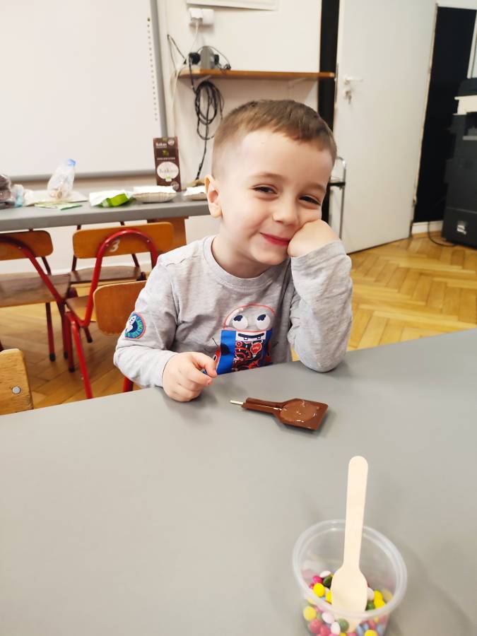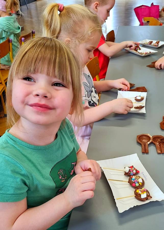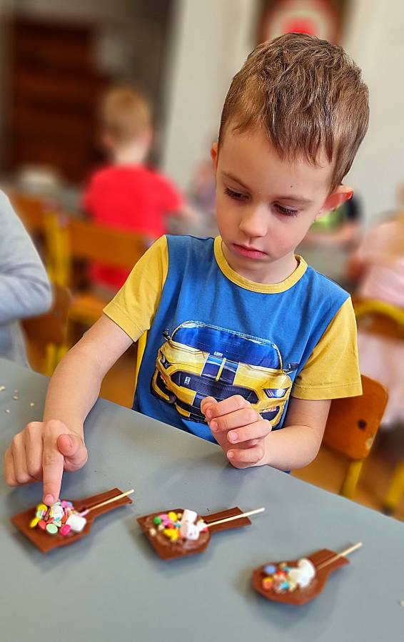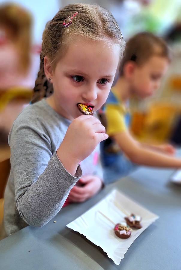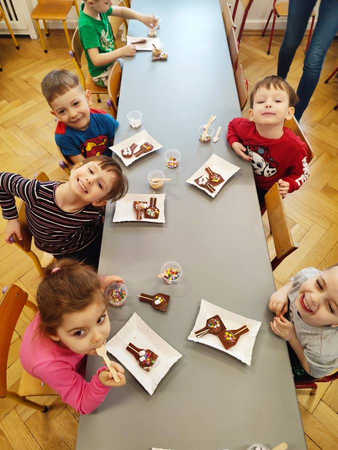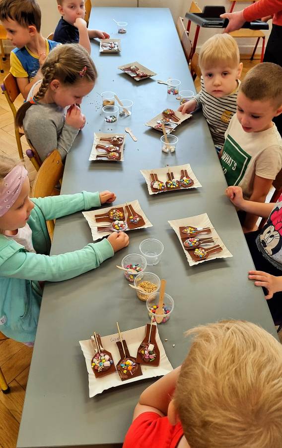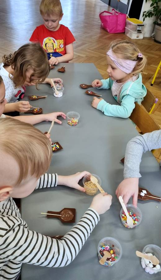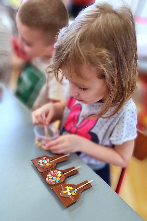 W Dzień Czekolady odbyły się warsztaty czekoladowe. Dzieci dowiedziały się, z czego i jak powstaje ta pyszna slodkość. Następnie przedszkolaki otrzymały formy z plynną czekoladą, wypełniły je kolorowymi ozdobami. Dwie grupy zrobiły pyszne lizaki, a kolejne dwie kolorowe czekolady. Dzieci mogły zabrać swoje słodkie arcydzieła do domu i poczęstować nimi swoich najbliższych.