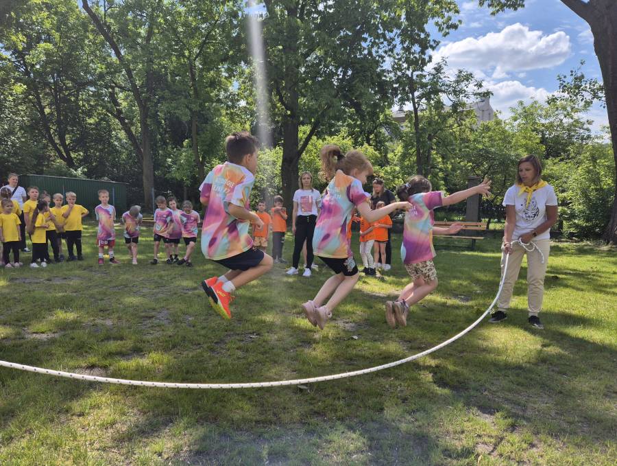 W słoneczne, czerwcowe popołudnie w Dwójeczkach odbył się długo wyczekiwany Piknik Rodzinny.Wydarzenie to zgromadziło dzieci, rodziców oraz pracowników przedszkola, tworząc wyjątkową atmosferę radości, zabawy i wspólnego świętowania. Piknik rozpoczął się występami przedszkolaków. Po części artystycznej na wszystkich czekało mnóstwo atrakcji ? loteria fantowa, gry i zabawy sportowe, malowanie twarzy, tatuaże, wspólne tańce przy muzyce oraz wystawa prac plastycznych Kumatych Żab -Portret Misia Uszatka. Nie zabrakło pyszności- wata cukrowa, popcorn, zakręcone ziemniaczki, chleb ze smalce... palce lizać. Dzięki zaangażowaniu rodziców stół z domowymi ciastami uginał się od słodkości, a grupa Kumatych Żab dzięki tym wypiekom zdobyła nagrodę ufundowaną przez Panią Dyrektor. Pogoda dopisała, humory również ? uśmiechy nie znikały z twarzy przez całe popołudnie.
