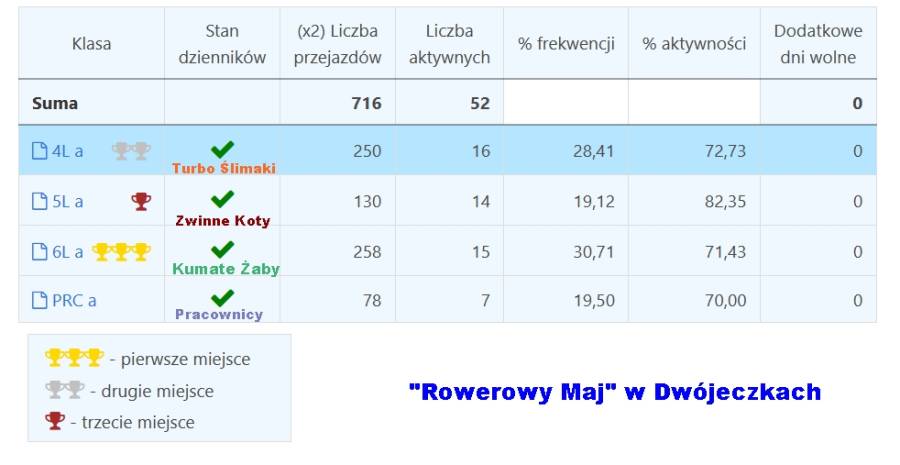 Rowerowy Maj dojeżdża do końca. Cieszymy się, że nasze przedszkolaki chętnie przyjeżdżały do przedszkola na jednośladac. Najbardziej aktywną grupą w tej kampanii okazała się grupa Kumtych Żab tuż za nią przyjeżdżały Turbo Slimaki, a za nimi Zwinne Koty ostatni przyjezdzali pracownicy(w przyszłym roku się poprawimy). Brawo dla Mikołaja za zajęcie 1 miejsca, Adama za zajęcie 2 miejsca i Nikity za zajęcie 3 miejsca. Nagrody zostaną wręczone przez Panią Dyrektor na rodzinnym pikniku.