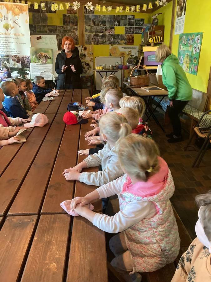Na miejscu przywitała nas pani Marzena, która z ogromną cierpliwością i w bardzo przystępny sposób opowiedziała dzieciom o tym, jak pracują pszczoły, jak wygląda ul od środka i jak powstaje miód.