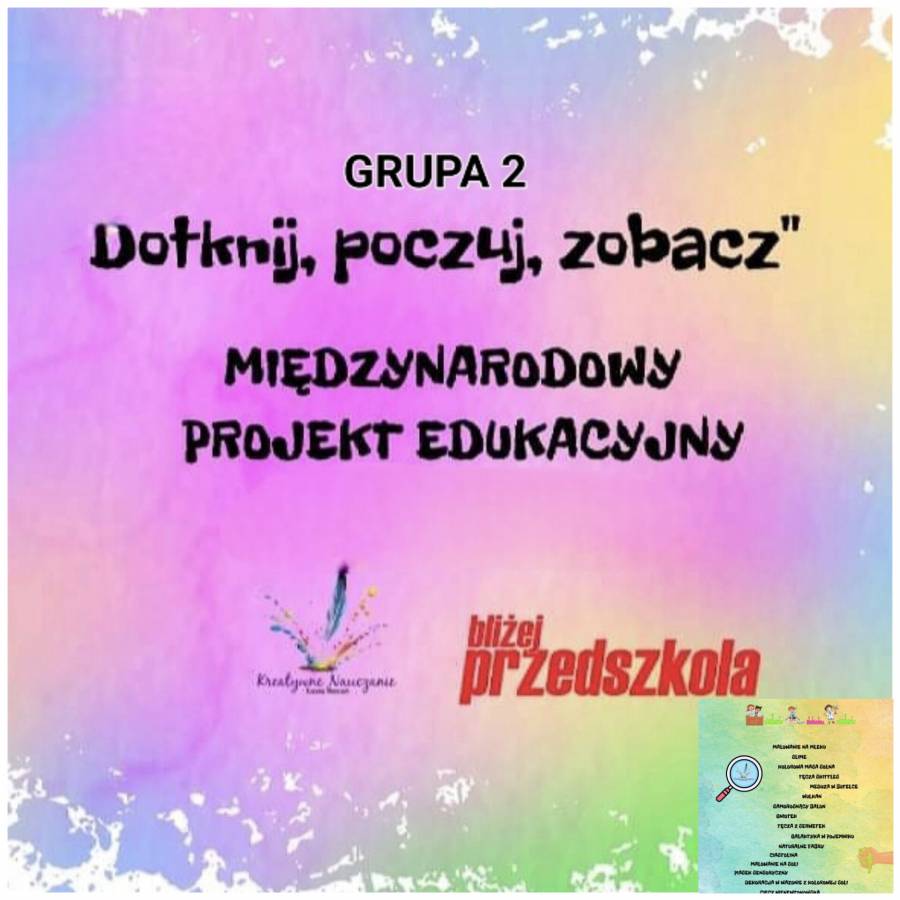 W ramach międzynarodowego projektu - Dotknij, poczuj, zobacz, dzieci z grupy 2 ze swoimi Paniami w pierwszym semestrze wykonały wiele ciekawych zajęć, które rozbudziły w nich pasję do tworzenia i eksperymentowania. Dzieciaki świetnie się bawiły przy wykonywaniu wybuchowego wulkanu, tęczy z cukierków i serwetek, tworzeniu gniotków i słoiczków z kolorowej soli.