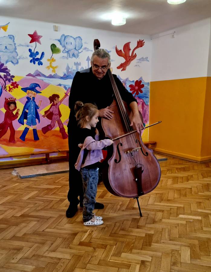Dziś do przedszkola zawitał Pan Witek ze swoim gościem i wielkim instrumentem. Dzieci miały okazje poznać kontrabas z bliska, zagrać na nim i wspólnie zaśpiewać piosenki. Na koniec nasze przedszkolaki zrobiły niespodziankę naszemu Panu Bogusławowi, który obchodził dziś imieniny, śpiewając mu "Sto lat". Każdy z nas dostał pysznego imieninowego cukierasa.