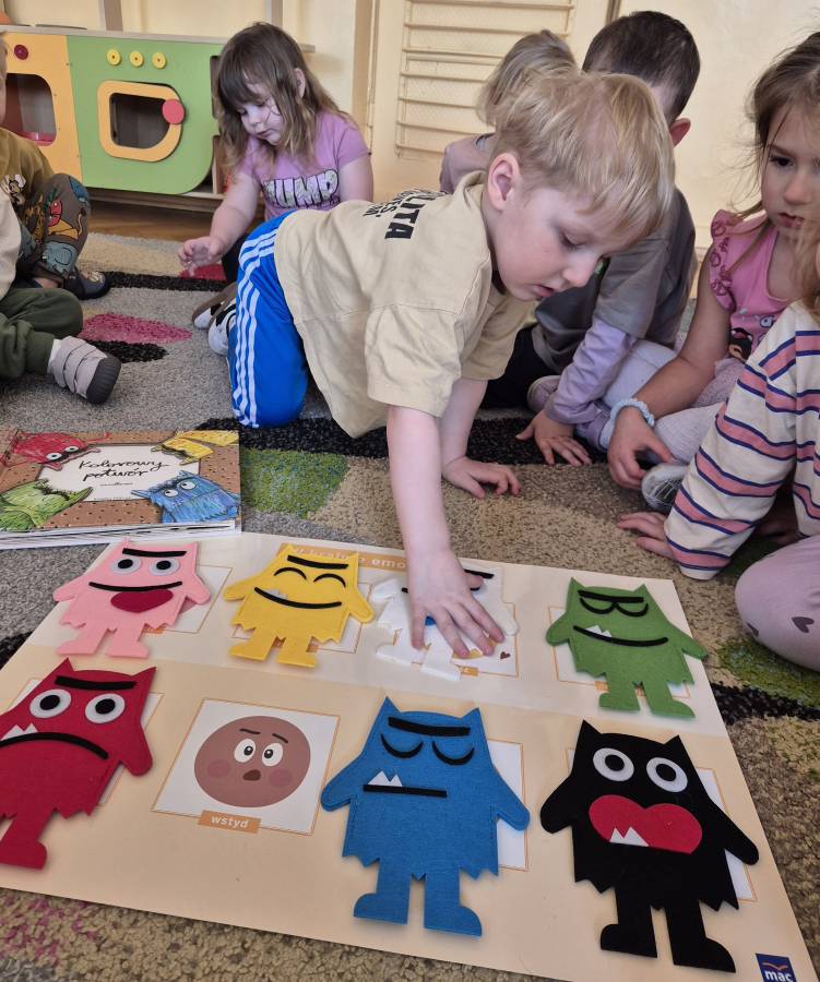 Emocje to bardzo ważna sprawa już w wieku przedszkolnym. Dziś nasze Kumate Żaby poznawały je, wspólnie czytając z Panią książkę ?Kolorowe potwory?. Dzięki niej dzieci mogły porozmawiać o różnych uczuciach ? radości, smutku, złości czy zdziwieniu. Po wspólnej lekturze uczyliśmy się, w jaki sposób można się uspokoić, kiedy pojawiają się trudne emocje , wykorzystując do tego pomoce sensoryczne.